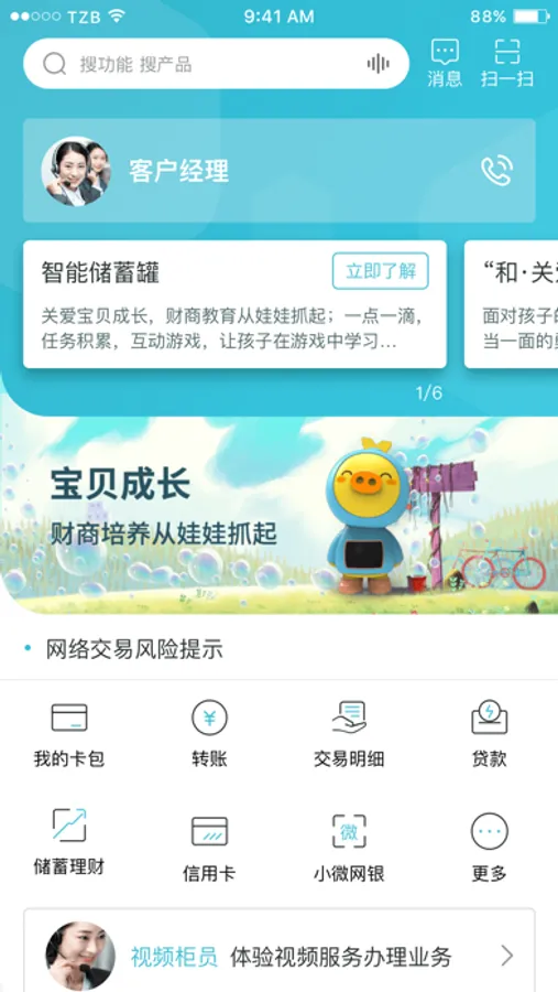 银座银行移动营业厅1.0版通过引入大数据、人工智能、生物识别、视频直播等技术,致力于为用户提供有温度、有速度、有深度的金融服务。