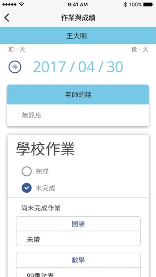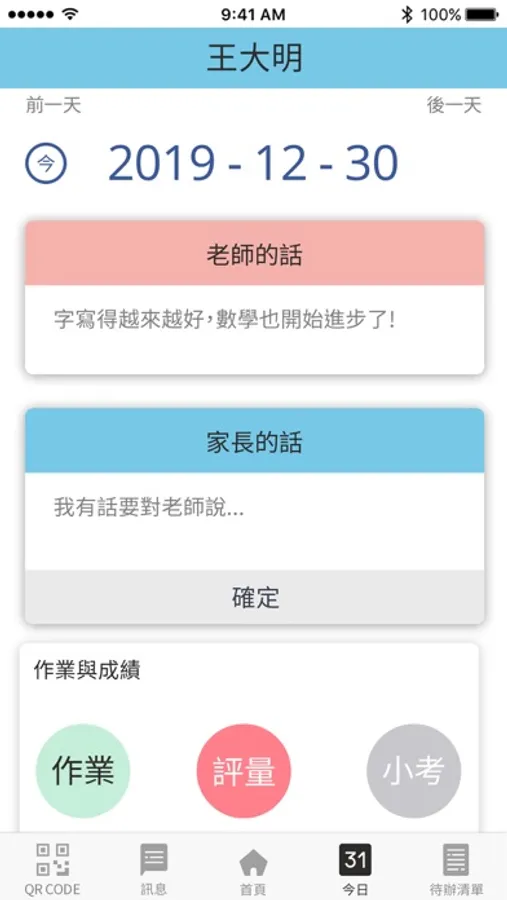 4. 作業與成績:家長可以由此快速得知學童的學校作業完成與否、安親班的練習評量完成與否,以及各科目的小考成績。