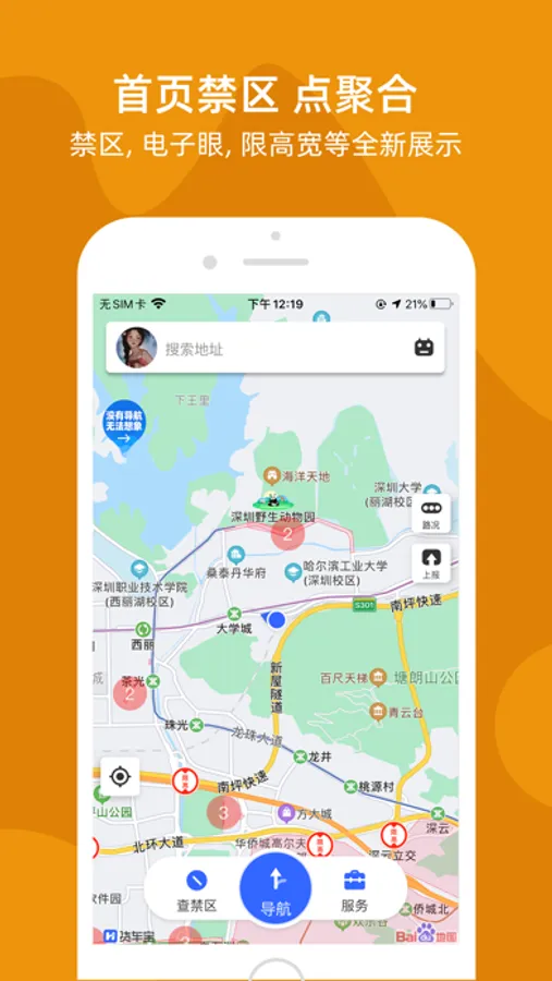 货车宝货车地图导航查禁区功能全免费,还可以免费违章查询,免费注册,免费使用!