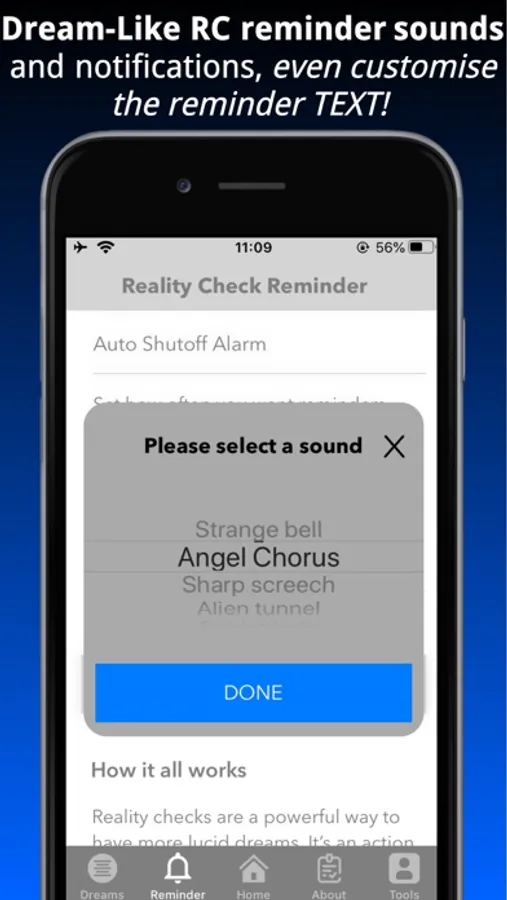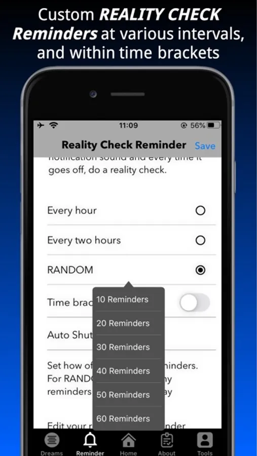 - Reality check reminders with custom times, time brackets, sounds, text and even frequency
