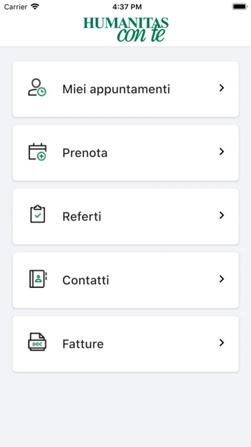 Humanitas con te è l'APP di Humanitas con cui puoi consultare in comodità e ovunque tu sia i tuoi appuntamenti, referti e documenti fiscali. Da APP puoi inoltre eseguire l'accettazione, pagare online prestazioni e servizi, prenotare visite ed esami.