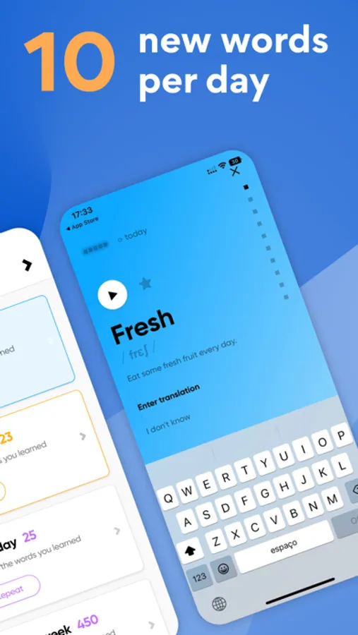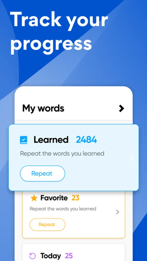 We will show new words in each lesson and remind you of past ones. A unique algorithm based on Hermann Ebbinghaus's “forgetting curve”. Effortlessly, words will go from your short-term to long-term memory. You will be surprised how effectively this method will affect the result.