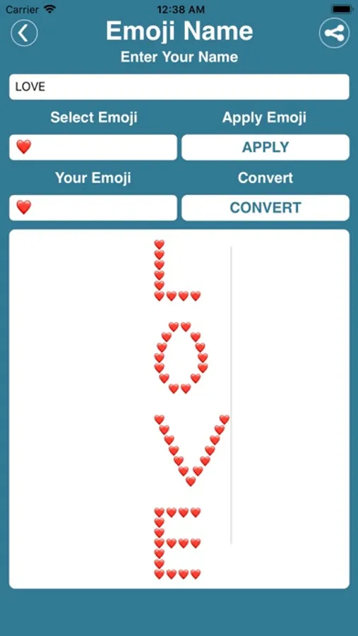 Send color text messages by preparing your own color message along with emoji name art and name shapes features. Enable the incredible emoji art and write words, names or any letter rapidly with your own choice emoji. Create text emoji and express your feeling, say any thing you entirely want using the emoji name art. Design your own name with the foremost emojis and share it with friends and family.