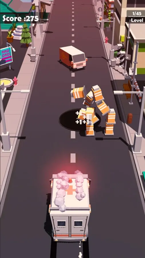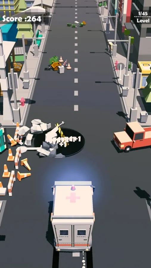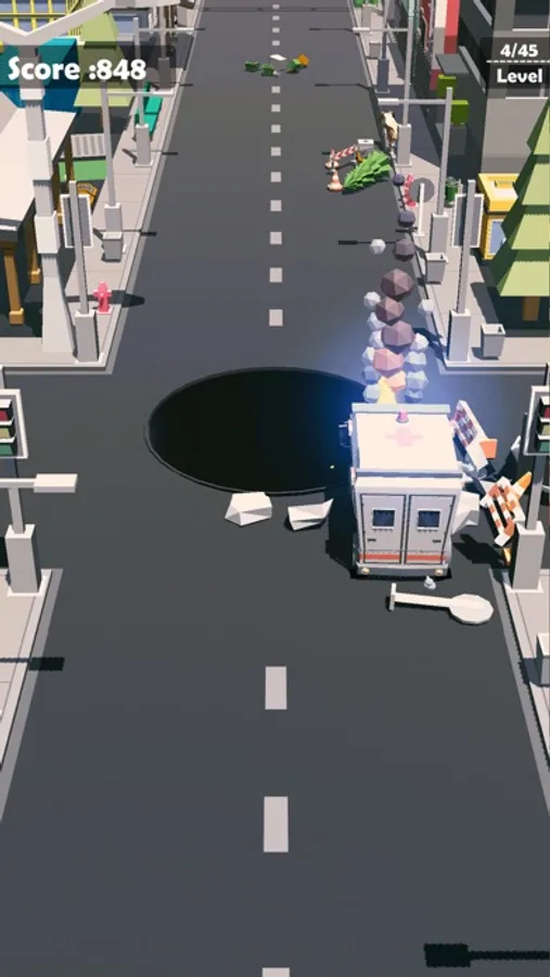 Pull all the obstacles into the hole to save the car. Be careful about the cars and people moving towards the car.