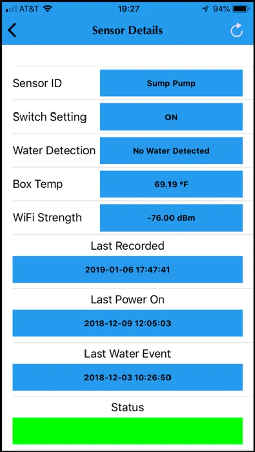 The application provides the Hardware ID, current water detection status, location temperature, power on date/time, and last water event date/time. The Application also provides support for monitoring multiple units.