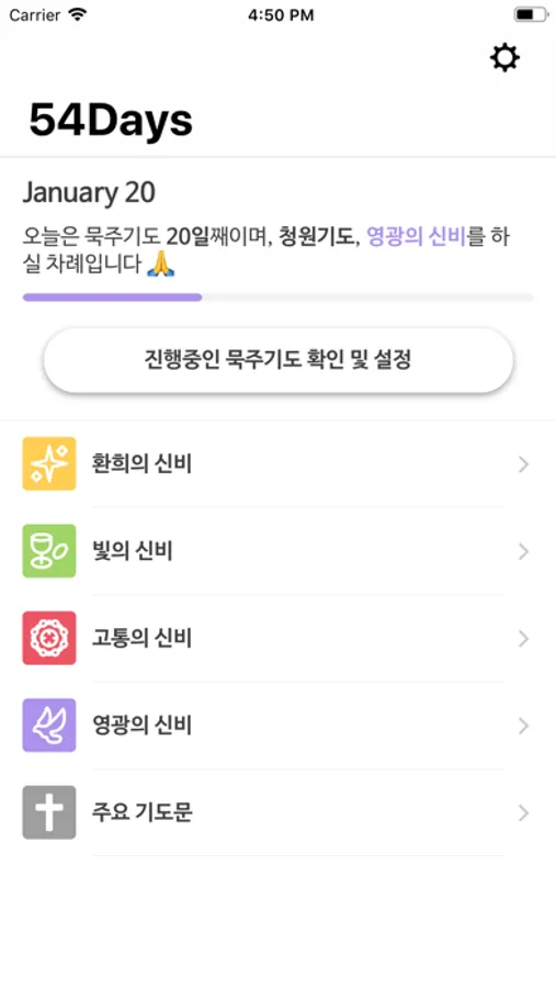 54Days is an app developed to aid your Rosary experience, with contents referenced from the book "묵주기도로 드리는 9일 기도" plus few features. Main features in the app are: