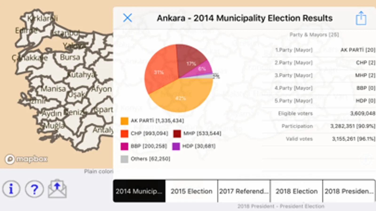 Turkey election results map TROYMAP Promo, is a special purpose mobile application designed to display past Turkish election results in a convenient manner. The app allows sharing of statistics over email or social media. You can tap on the city to display election results. You can zoom in to see counties and tap on the county to display details. You can also access political party details that are mentioned in election results of the TROYMAP Promo app. All data you access on TROYMAP Promo are obtained from official final election results. Election results available : 30 June 2014 Municipality election, 1 October 2015 26.th term Representative elections, 14 April 2017 Constitution change referendum, 24 June 2018 27.th term Representative elections, 24 June 2018 Presidential election