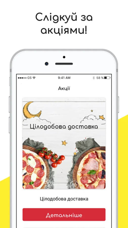 Ми ділимо місто на дві зони доставки – зелену та жовту. В зеленій зоні час доставки до 29 хв (з 23:00 до 10:00 час доставки 59 хв), в жовтій зоні - до 59 хв. Якщо кур'єр спізнився хоча б на 1 хвилину, Ви отримуєте промокод на безкоштовну піцу або суші до свого наступного замовлення.