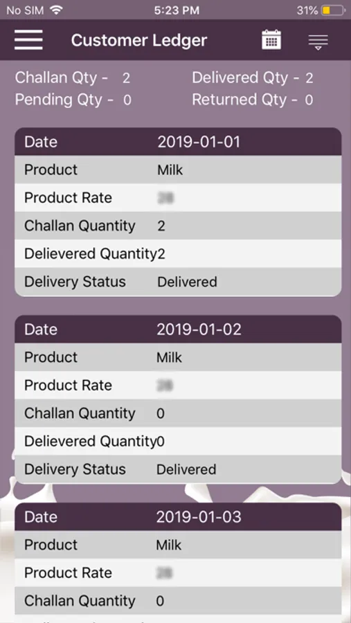 - Customer can check their ledger for Delivery of their Daily Order They can filter by Start or End date for previous or by status.