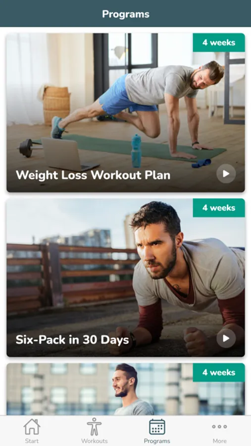 The app offers 4 free workouts and you can purchase one of the 5 programs. The workout programs increase gradually in intensity for 4 to 10 weeks. Basically all our exercises need no equipment: you can use your body weight itself as an equipment.