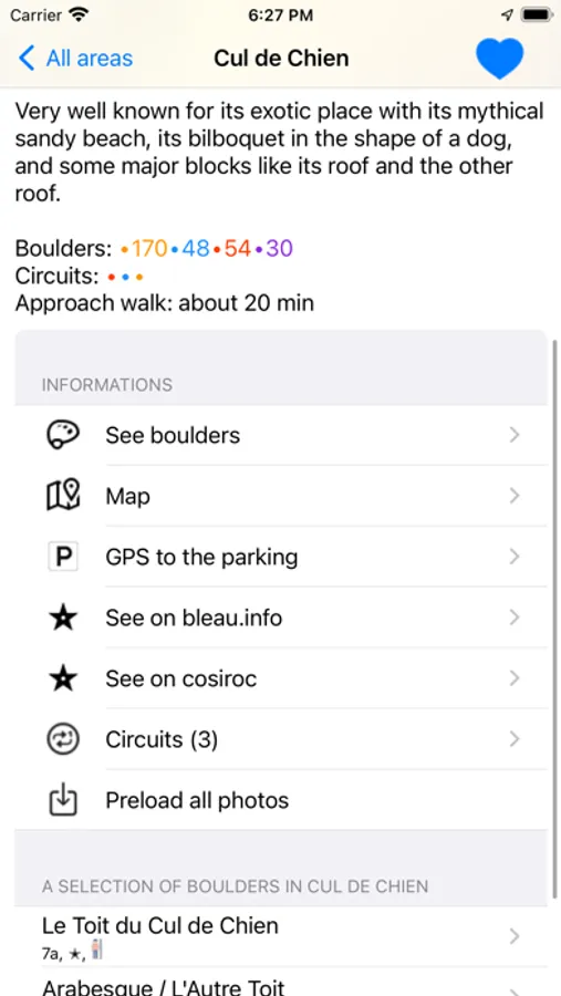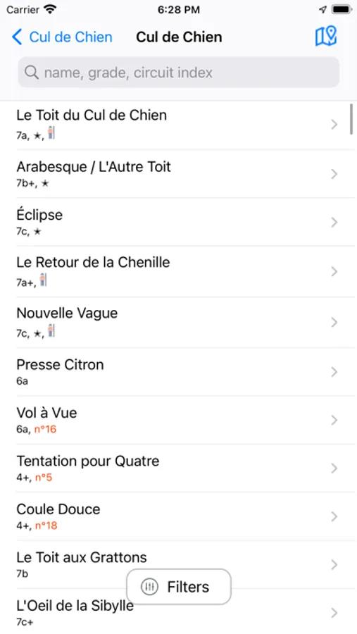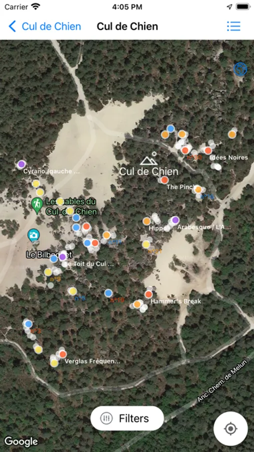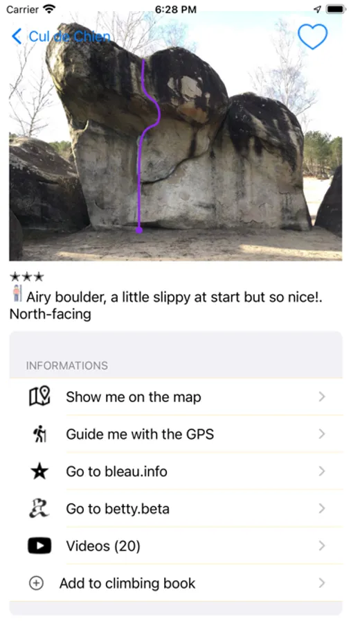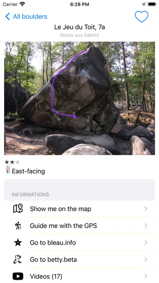 Topo Bleau also offers you access to nearly 30,000 boulders, including more than 4,600 geo-referenced boulders. Each one is accompanied by a photo that shows the existing openings (like our good old paper topo). Every month, new boulders are added. It's a real guide that will also tell you which are the major boulders of the forest, those that are feasible even if you are not tall, and for the hardest boulders, those that are oriented north (ideal in summer), south (ideal in winter) and even east/west (if you are more of a morning or afternoon person). Also if you only want to do slabs, overhangs or traverses, it is possible to filter. Also, for most boulders, direct links to online videos and circuits allow to save precious time in forest.