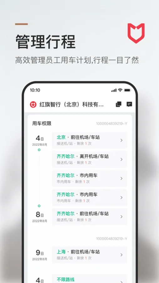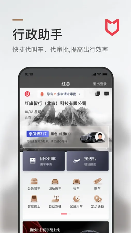 平台旨在突破企业出行局限,以科技引领美妙出行。线下优选红旗H7、H5、E-HS3为主力运营车型,业务覆盖政务、公务、商务等多类出行场景,包括接送机、差旅用车、公务用车、客户接待、会议用车、酒店服务、加班通勤等。