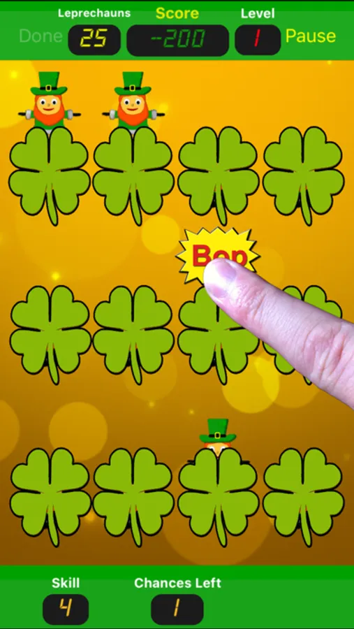 Use your finger to bop the Leprechauns as they pop up. Bop the number of Leprechauns needed to complete each level. Complete all the levels and win the game! How many Leprechauns can you bop? You have to play to find out.