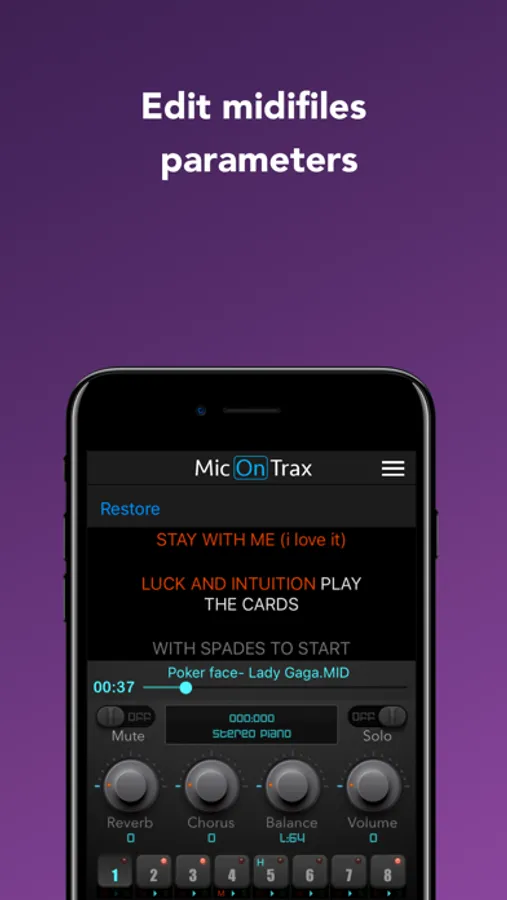 * Note: this free version only play half the duration of the song and does not allow the song parameters to be saved. Please unlock these limits with in app purchase