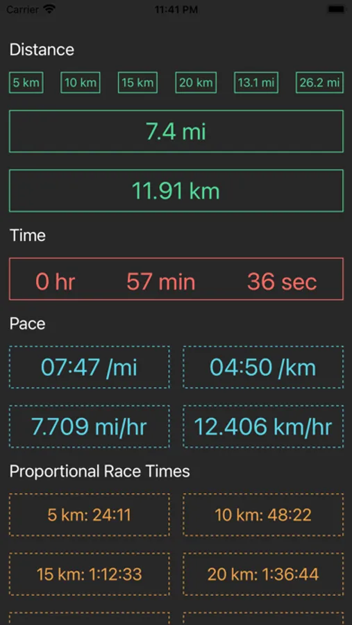 This app allows you to quickly determine your proportional race times based on your run distance and time. Simply enter the time and distance you ran then automatically see what a proportional time would be for common race distances like 5km, 10km, 15km, 20km, 13.1 mi, and 26.2 mi. In addition, it will automatically show your min/mi, min/km, mi/hr, and km/hr.