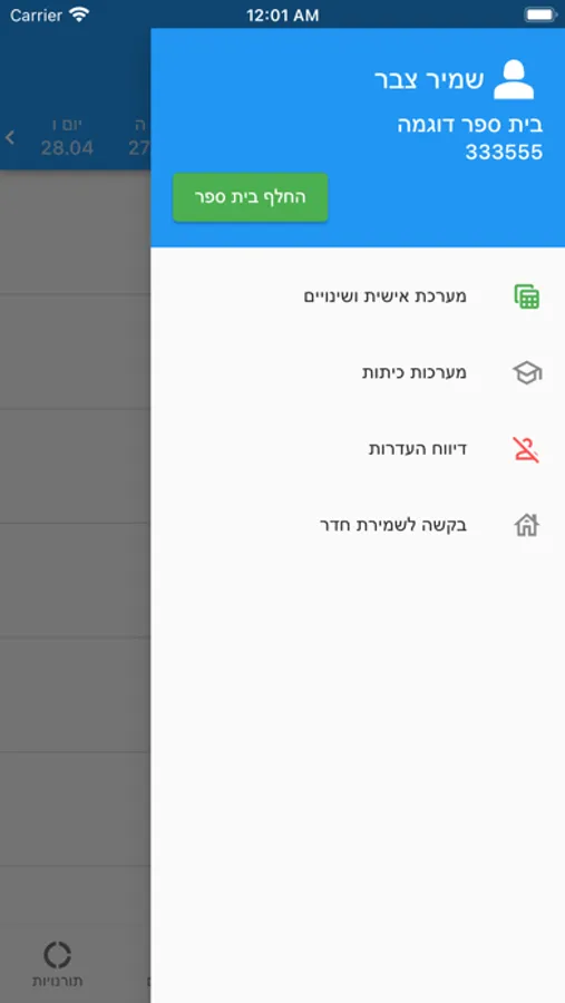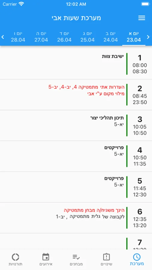 תצוגה של מערכת שעות בית ספרית, מיועדת למורים מבתי ספר בהם משתמשים במערכת שעות שחף