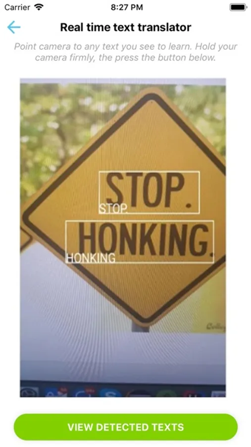 - Realtime learning. With innovative AI and machine learning technologies integrated in your system, you can translate any object around into English to learn vocabulary. In addition, any text such as street signs, advertising labels, document, etc. are also "translatable" on your hand by just one click.