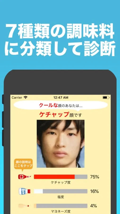 「診断結果の〇〇顔ってどんな顔?」と思った場合は、調味料のイラストをタップすると、その顔の説明文が表示されます。