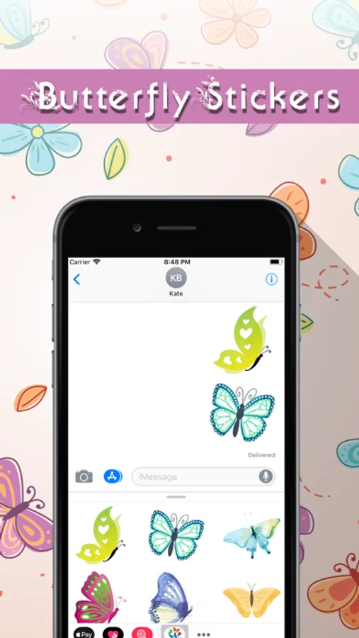 • Tap the icon on the lower left corner and then the plus icon to access the App Store for iMessage. Tap Manage tab and find Butterfly Stickers Pack to add it.