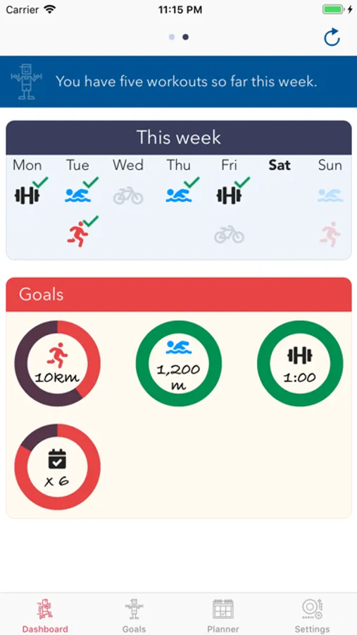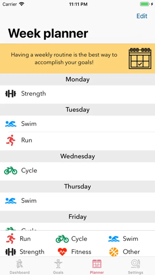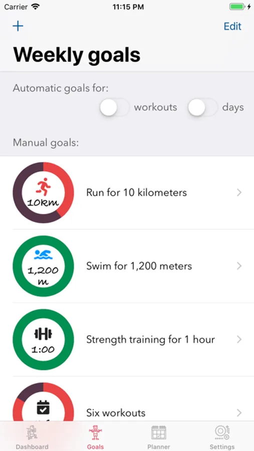 Set up a weekly workout routine, and get a quick visual overview of your week's goals vs. achievements. No hidden fees, no ads, no personal data collected, and completely FREE.