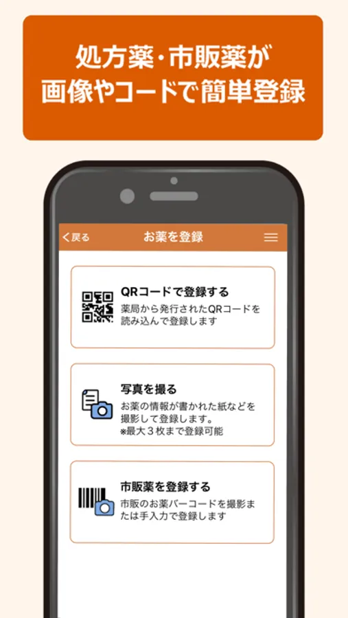 -QRコードで登録:薬局で発行しているQRコードを読み込んでお薬を簡単に記録できます。