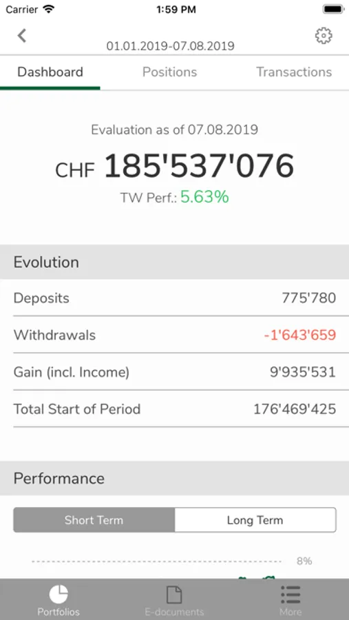 - Portfolio : access the details of your portfolios, positions held and find all your transactions, movements and analysis by asset class or currency.