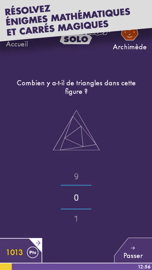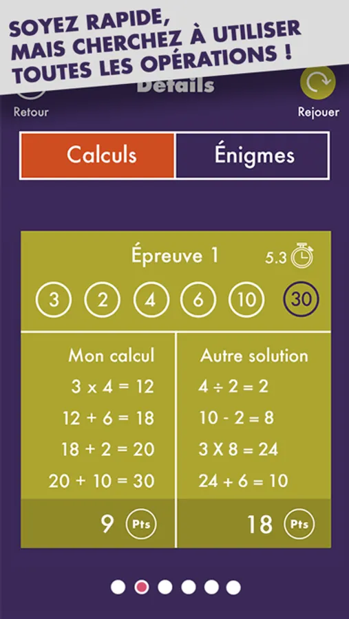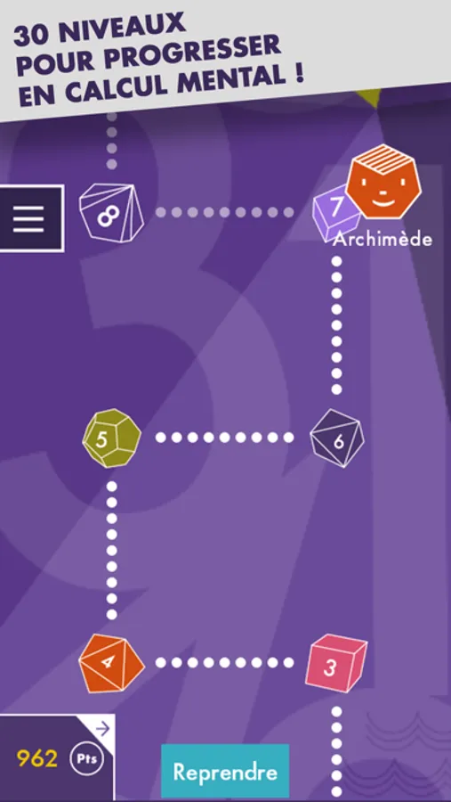 Enchaînez des épreuves de calcul de type « compte est bon » et des énigmes mathématiques (carré magique, suite logique, petits problèmes mathématiques à résoudre...) pour atteindre le plus haut niveau. Au fur et à mesure, les épreuves sont de plus en plus compliquées et le chronomètre de plus en plus court... Décrochez trophées et bonus : vous allez être surpris par votre progression en maths !