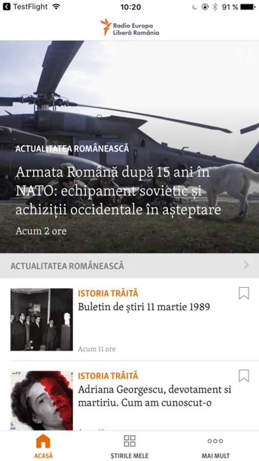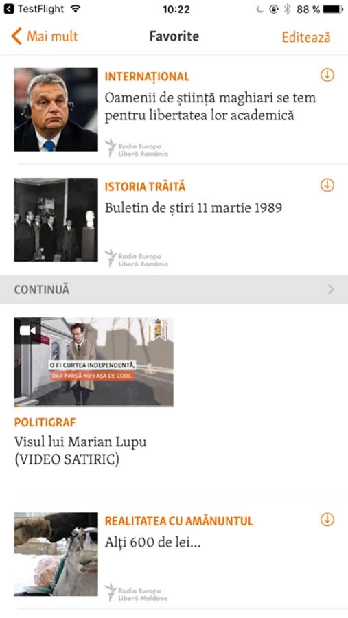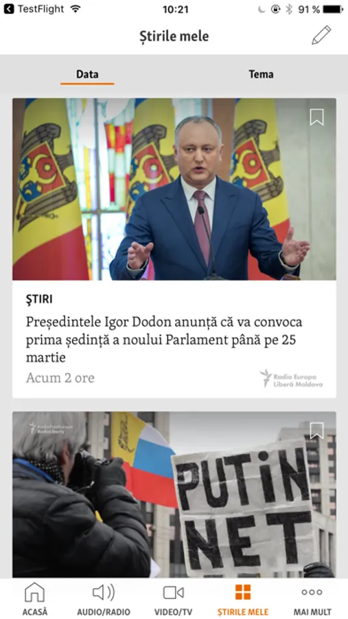 Aplicația Europei Libere care îți permite să urmărești actualitatea politică, economică sau culturală din România și Moldova. Poți alege țara și subiectele de interes, poți urmări știrile în român, rusă sau engleză.