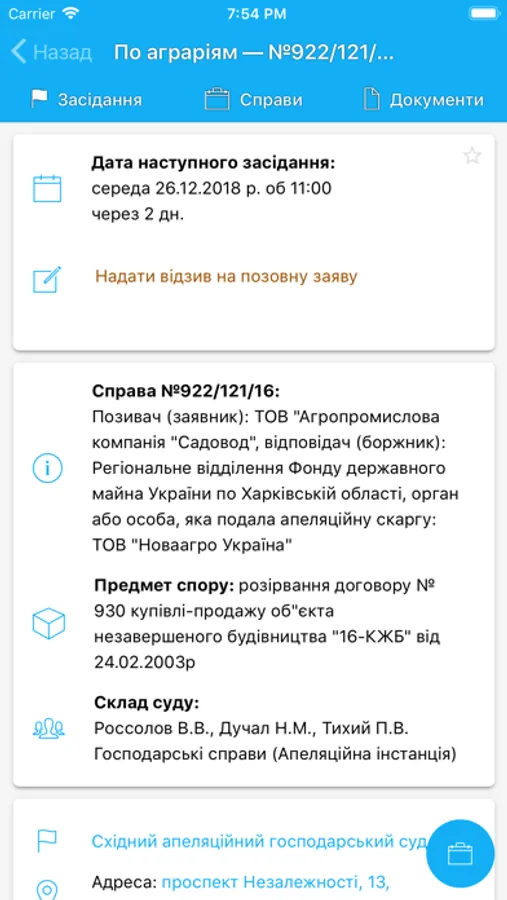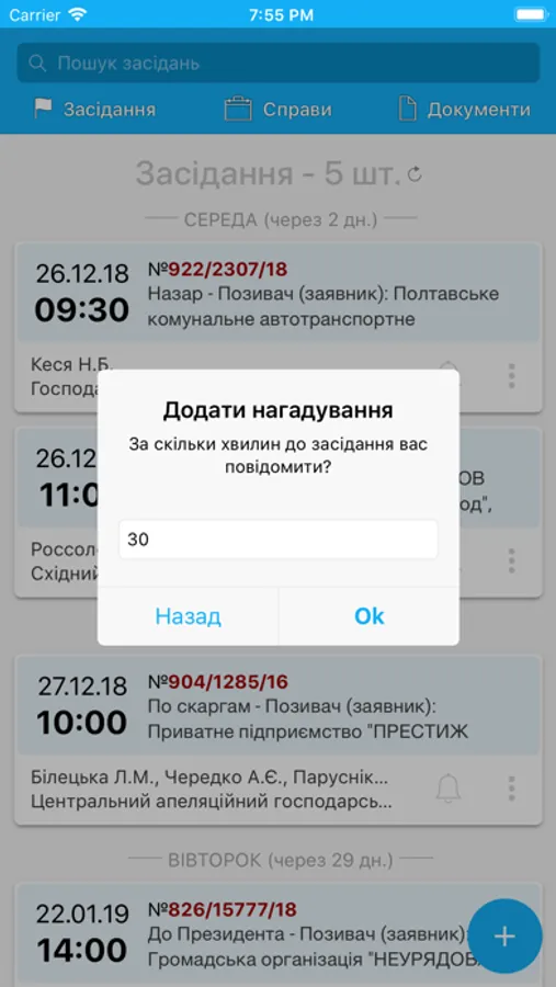 - повідомляти про появу нових засідань та судових документів по Вашим справам