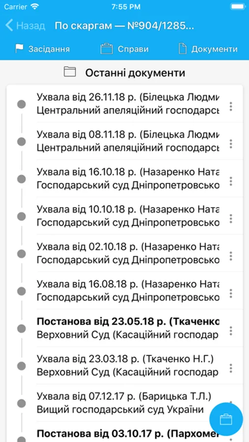 - останні документи по справі (постанова, рішення, ухвала, вирок, судовий наказ), що знаходяться в реєстрі судових рішень