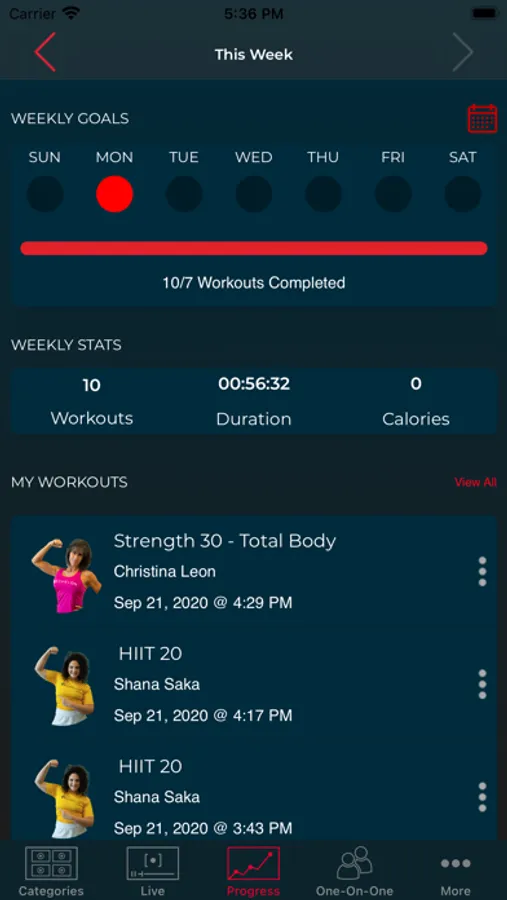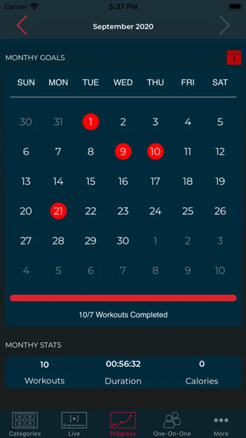 • Track your progress including workouts completed, calories