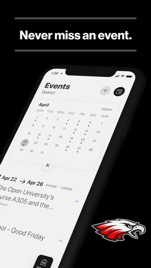 The event section shows a list of events throughout the district. Users can add an event to their calendar to share the event with friends and family with one tap.