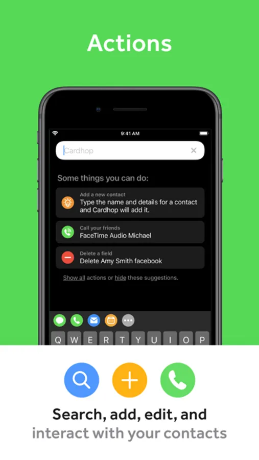 Just type in “John G” and John’s card will instantly appear. Or enter “Sarah Smith sarah@cardhopapp.com” and Cardhop will add a new contact to Sarah’s card. Or type in “call Michael S” and Cardhop will instantly start a phone call.