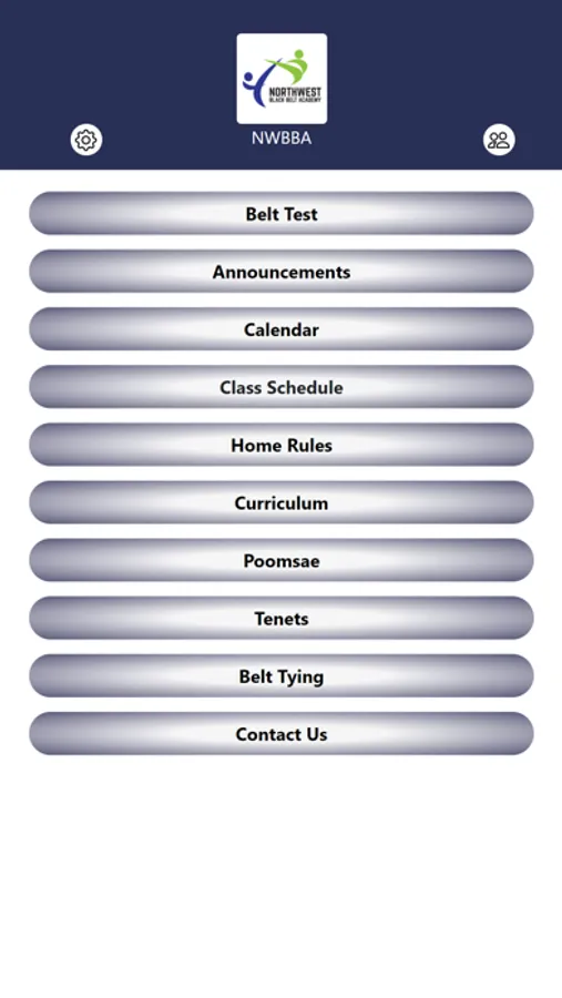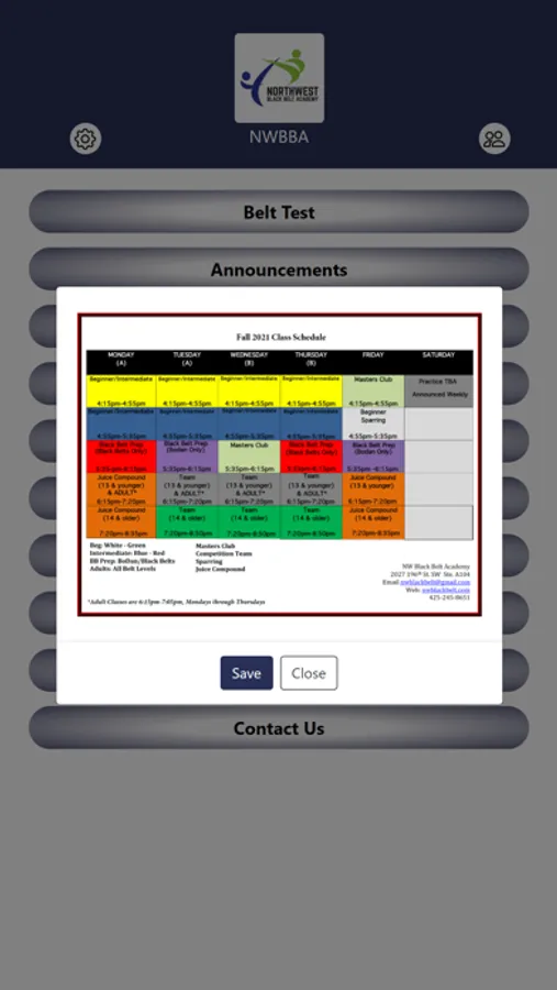 Shows school announcements, calendar, class schedule, home rules, poomsae & belt tying videos and more...