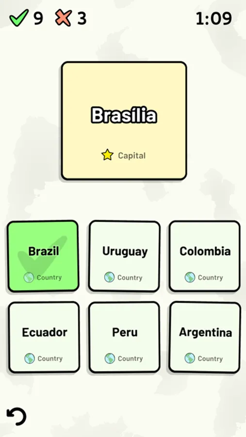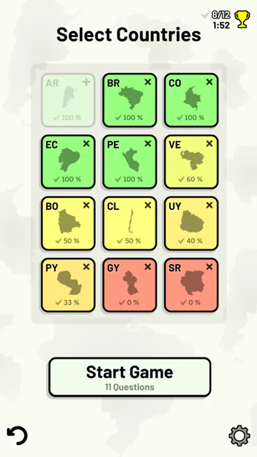 Standard quizzes allow you to learn each topic by progressing through a series of levels, each covering additional countries.