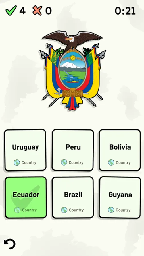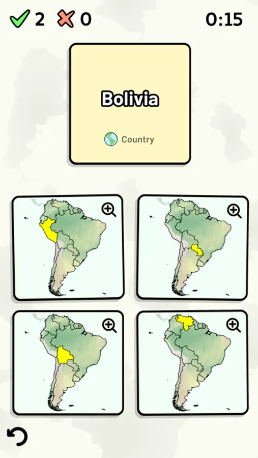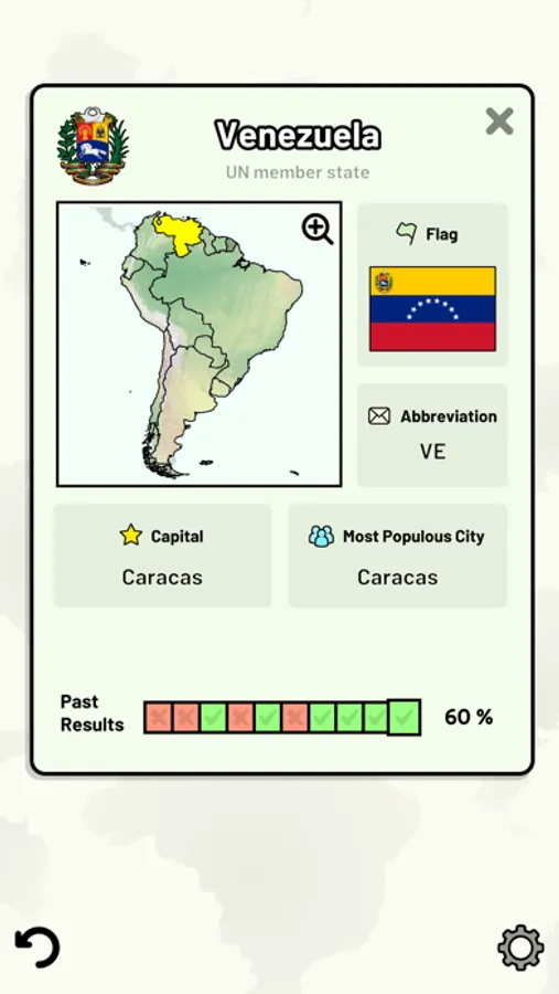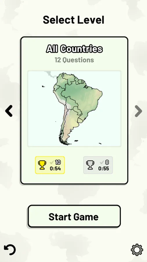 Customizable quizzes allow you to choose which South American countries to test, as well as the topic. Past results for each country are displayed to highlight your progress at each topic.