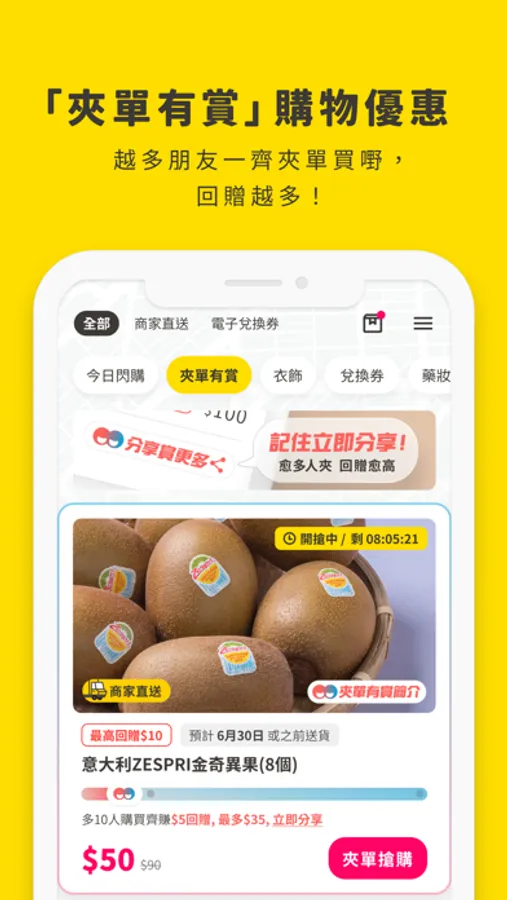「夾單有賞」購物優惠,越多朋友一齊夾單買嘢,回贈越多,買得多賺得更加多!