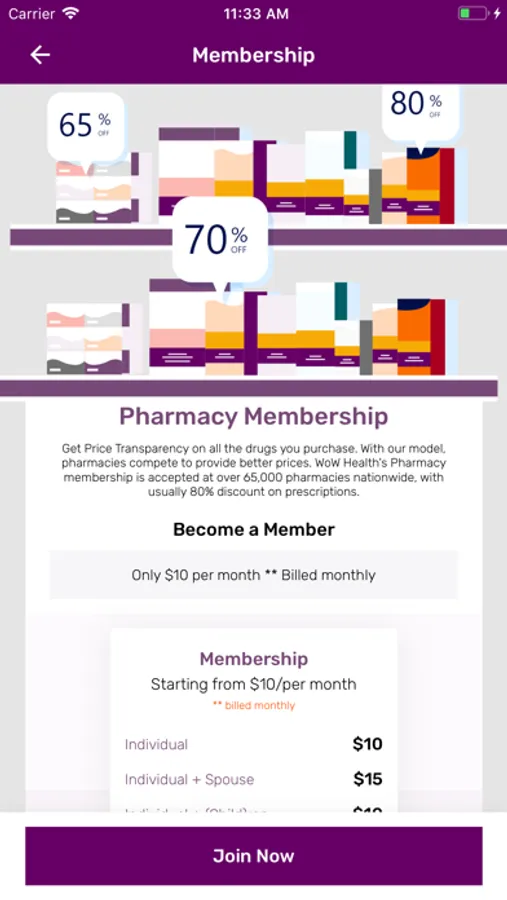 3. Pharmacy Membership: WoW Health's Pharmacy membership is accepted at over 65,000 pharmacies nationwide, with usually 80% discount on prescriptions.