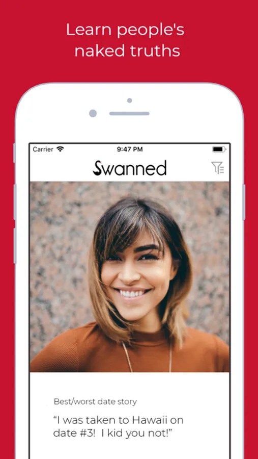 ADVANCED FILTERS: Isn't it annoying when you realise you're a raver, but they are a behaver? Or you’ve been on a bunch of dates and then they say they don’t want kids? Use Swanned's Advanced Filters to select the important things you are looking for, making it even easier to find your ideal partner.