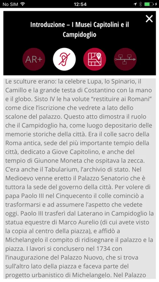 L’applicazione dei Musei Capitolini presenta una modalità innovativa di fruizione per una visita del museo con più livelli di approfondimento grazie all’ausilio della tecnologia beacon BLE che permette al visitatore di orientarsi con facilità nelle sale del museo, della Realtà Aumentata che consente di accedere a contenuti esclusivi di approfondimento su alcune opere del museo e delle Panoramiche, scatti a 360° di prospettive inedite e scorci mozzafiato.