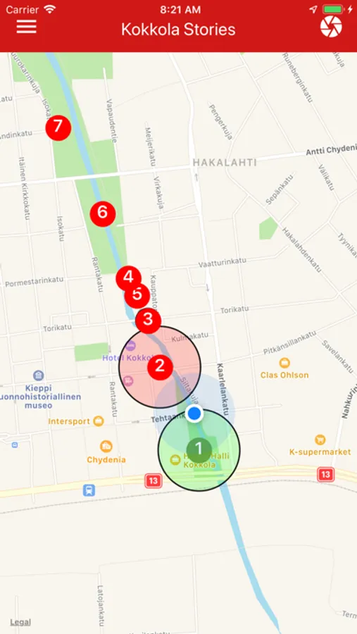 Kokkola Stories esittelee kymmenen kohdetta Suntin varrelta. Kun olet tarpeeksi lähellä kohdetta, voit perehtyä puhelinsovelluksen avulla sen historiaan. Sovelluksen AR-näkymässä voit astua sisälle ruudulle ilmestyvästä aikaikkunasta ja tutustua kuva- ja äänimateriaaliin. Muistathan palata takaisin nykyaikaan ruudussa näkyvän aikaikkunan kautta!