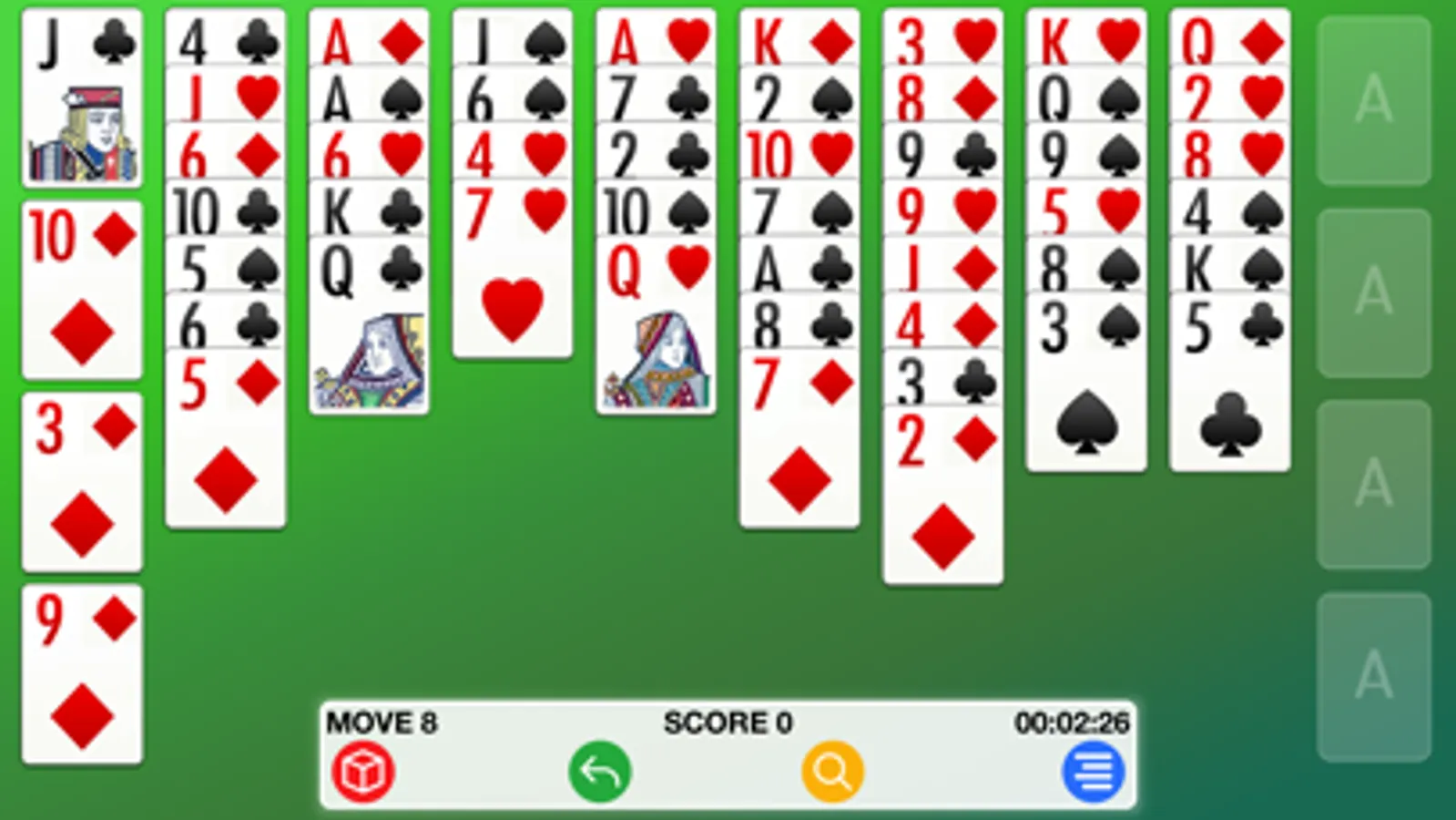 Freecell. A solitaire card game, whose objective is, like in Klondike, moving all the cards to the foundations based on their rank, from ace to king of the same suit. The cards are initially dealt in eight columns on the tableau. The cards on the tableau can be built down by alternating colors