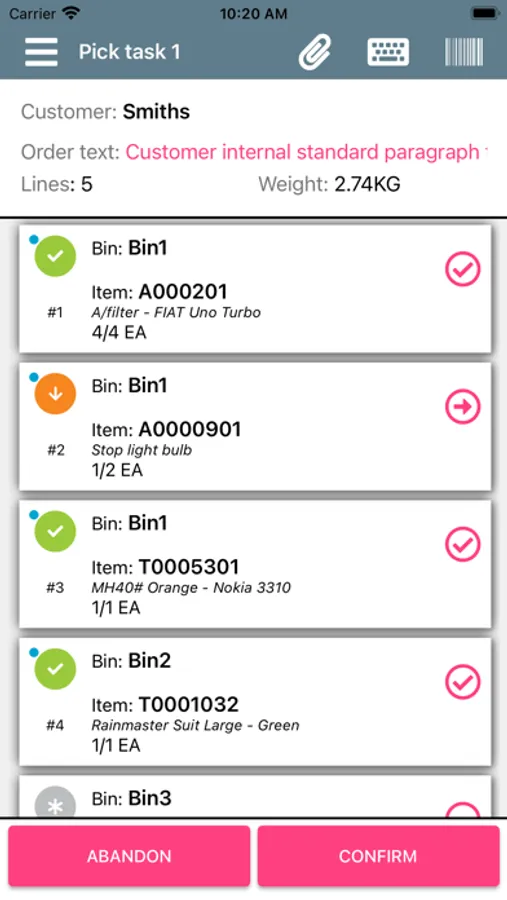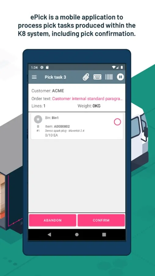 Although the application will require connection to initially download and ultimately confirm the pick task, the actual confirmation of pick lines can work offline.