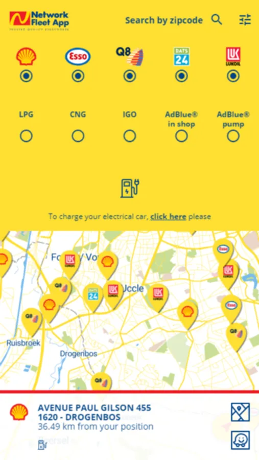 The Network Fleet App shows all the sites where you can fuel or charge your (electrical) car at Shell, Q8, Esso, Dats 24,TotalEnergies in Belgium & Europe. The Network Fleet Card offers you the largest network of gas stations (2000 sites in Belgium and 25.000 in Europe) and the app will show you the nearest stations to your position (geo-localization) wherever you are in Belgium or in Europe. So, the app will save you precious time to find the nearest site from your position.