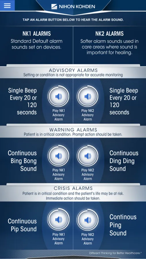 Nihon Kohden's Alarm App is designed to introduce the end user to the different alarm colors and sounds associated with our suite of patient monitoring products.