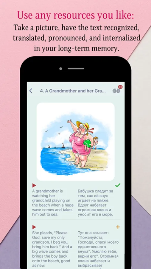 Take a picture of text from any textbook, poem, or social media post in a foreign language, and have it saved as a card in the app. Then, following a series of repetitions with the help of constant reminders – the information will be internalized in your long-term memory.