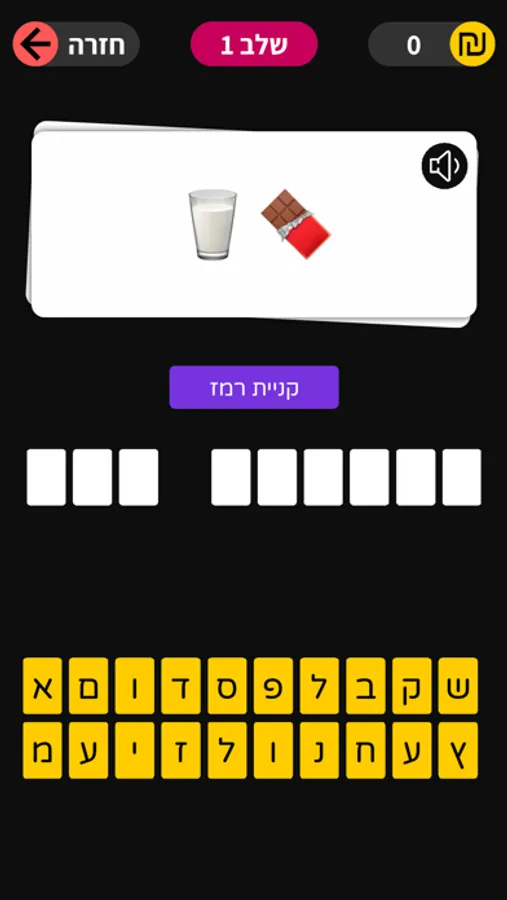 1) בשלב הראשון ניתן לראות סמיילי של חפיסת שוקולד + סמיילי של כוס חלב, ולכן התשובה תיהיה "שוקולד חלב".