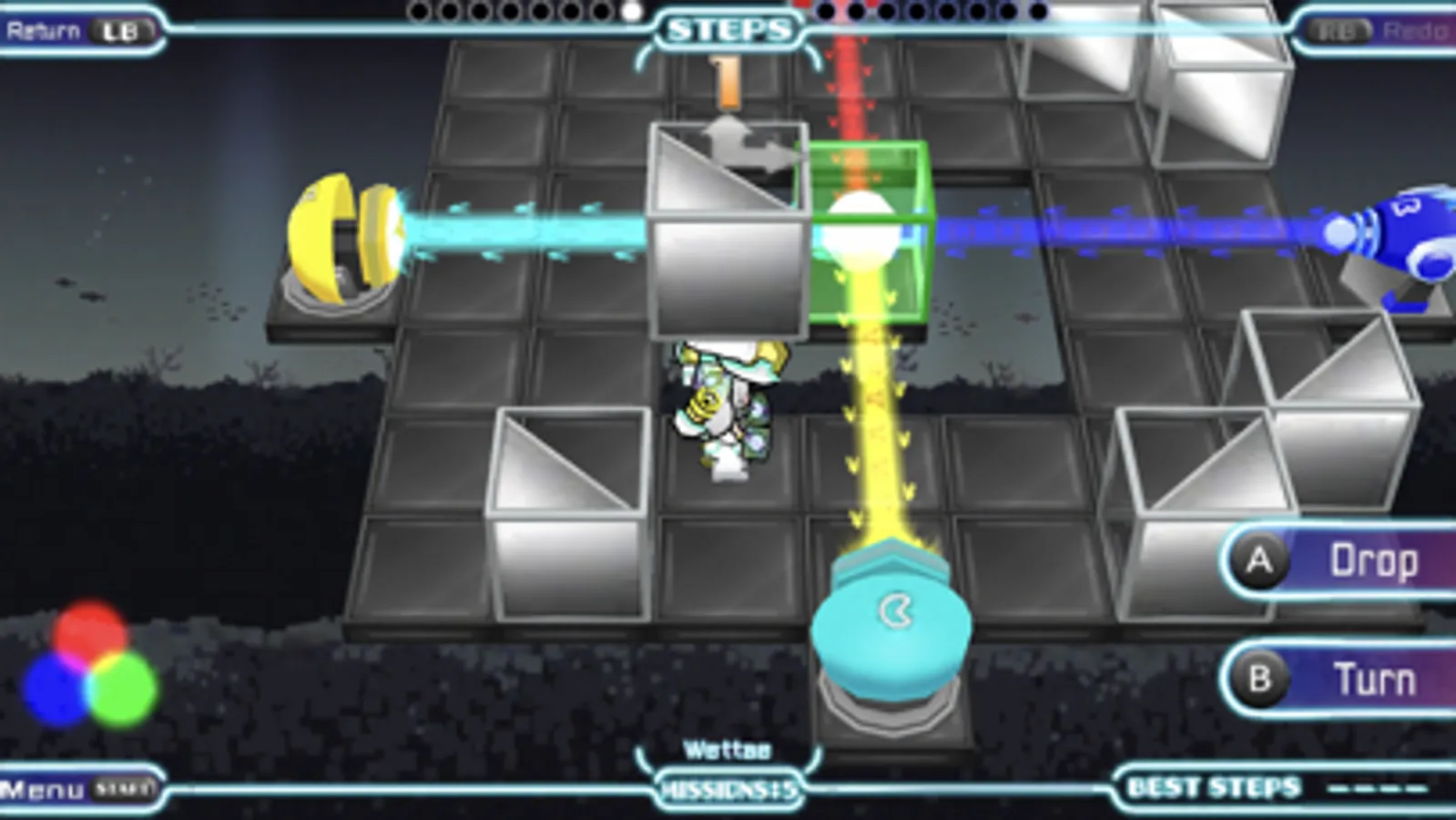 The stage is cleared when all lights are directed to their colored goals!