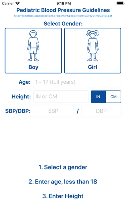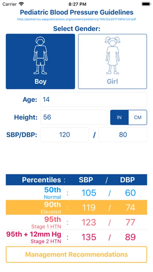 Simply select gender, enter an age and height, the blood pressure percentiles will then appear at the bottom of the screen. You also have the option to enter in a measured blood pressure, which entered along with your patients' gender, age and height, will highlight the closest blood pressure percentile.
