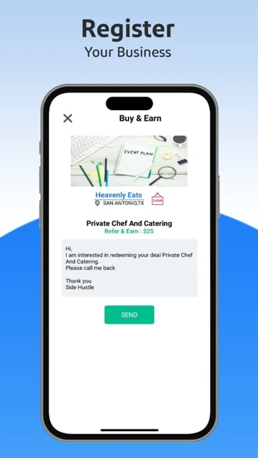 TURN YOUR FREE TIME INTO EXTRA CASH. The Side Hustle app enables anyone to make money from home by promoting businesses you love and it’s such an easy way to make money. Find a local or national business, select an offer find friends and family who would love to purchase products or services, or refer yourself and get paid for your efforts!